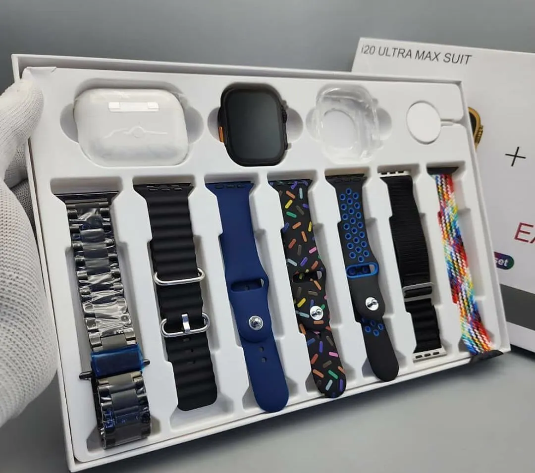 The I20 Ultra Max Smart Watch is a premium 2.3 inch large screen smartwatch designed for versatility and style. This 10-in-1 box set includes 7 interchangeable straps for a customizable look and comes with AirPods 2 for a complete smart experience. Key Features: 2.3-Inch Large Display Clear and vibrant screen for easy navigation. 10-in-1 Box Set Includes multiple accessories for an all-in-one experience. 7 Interchangeable Straps Change styles effortlessly for different occasions. AirPods 2 Included Wireless earbuds for seamless connectivity. Smartwatch Functionality Designed for fitness tracking, notifications, and daily convenience. Ideal for those who want a stylish and functional smartwatch, the I20 Ultra Max combines innovation, convenience, and premium accessories in one package.